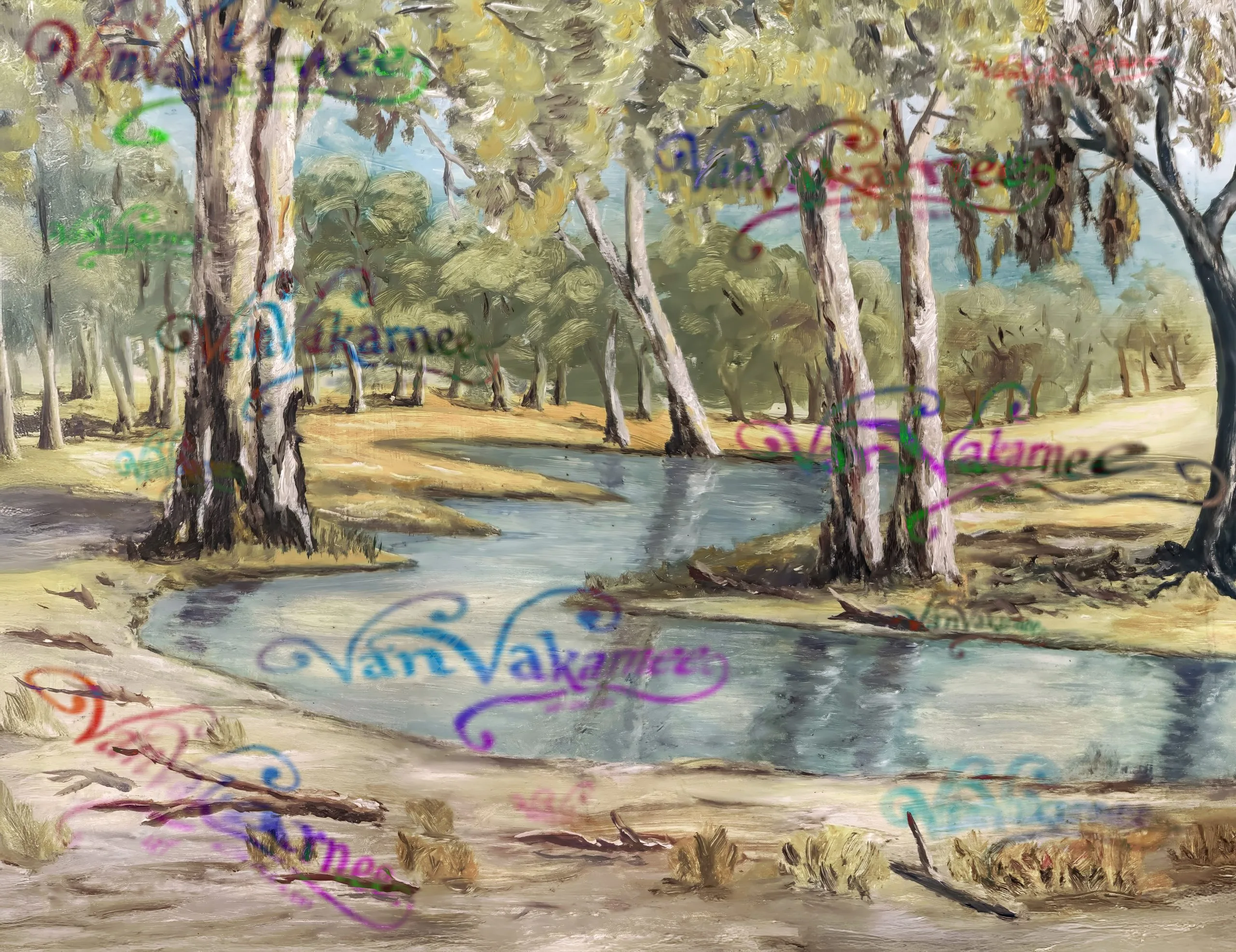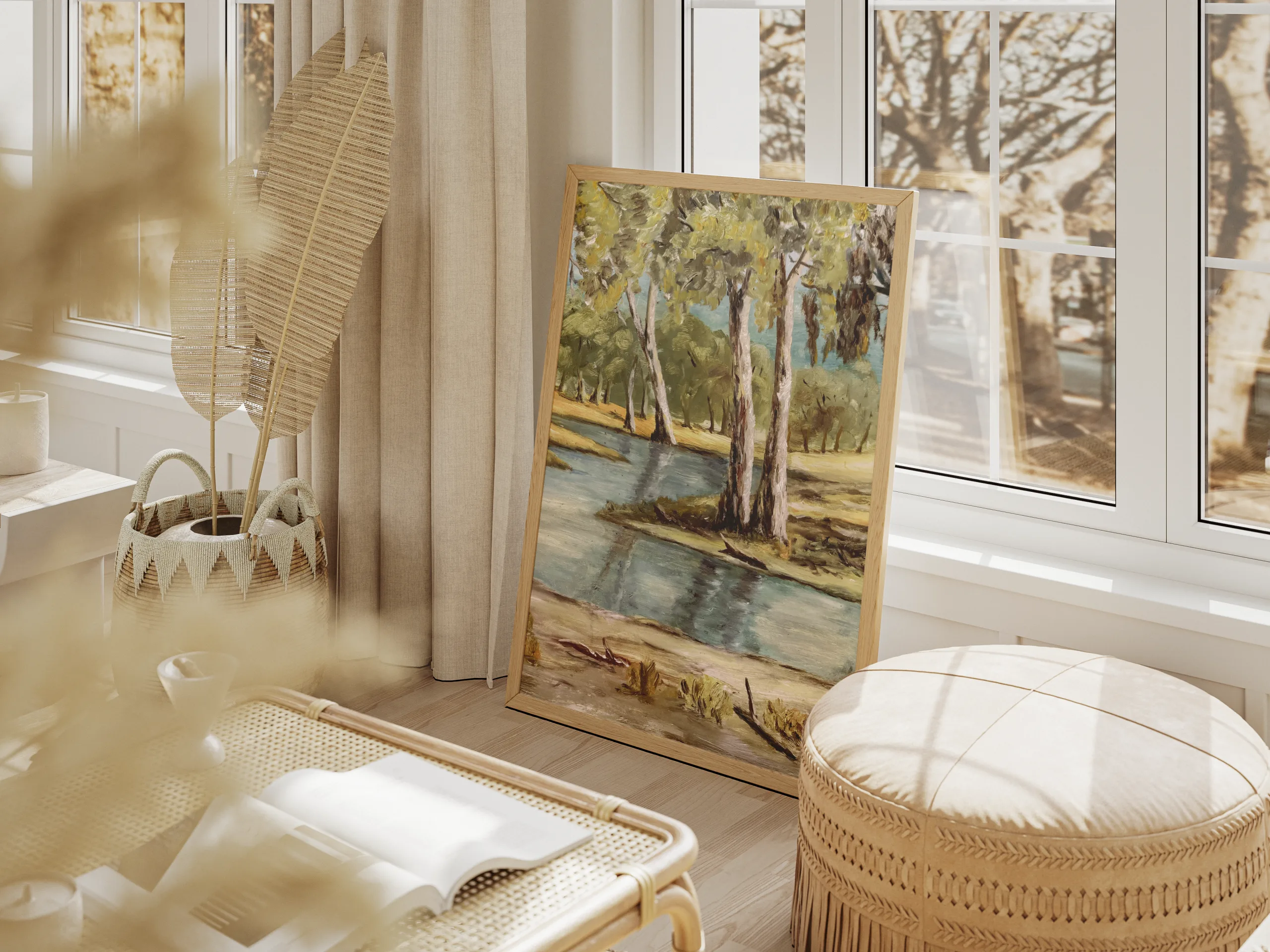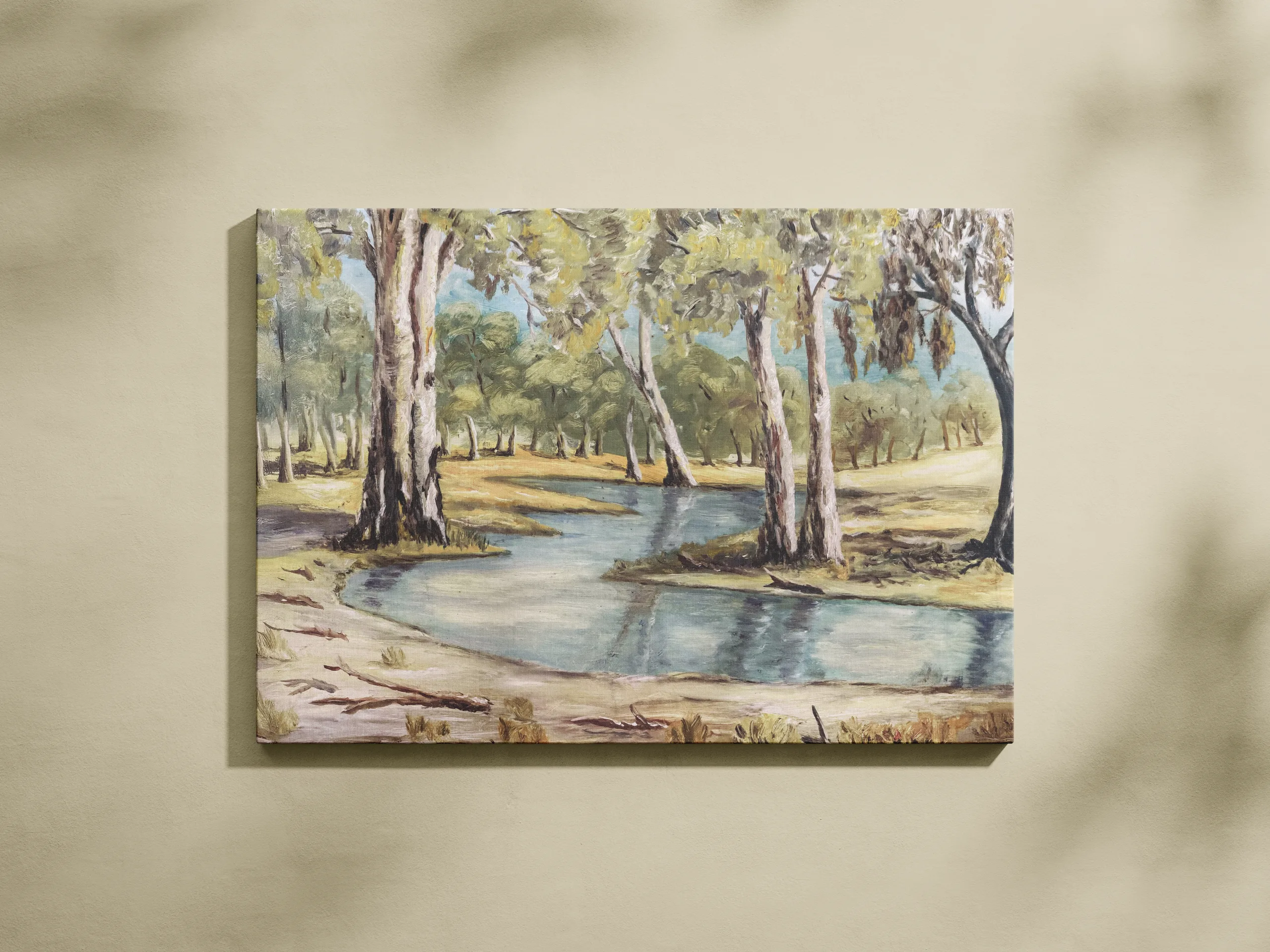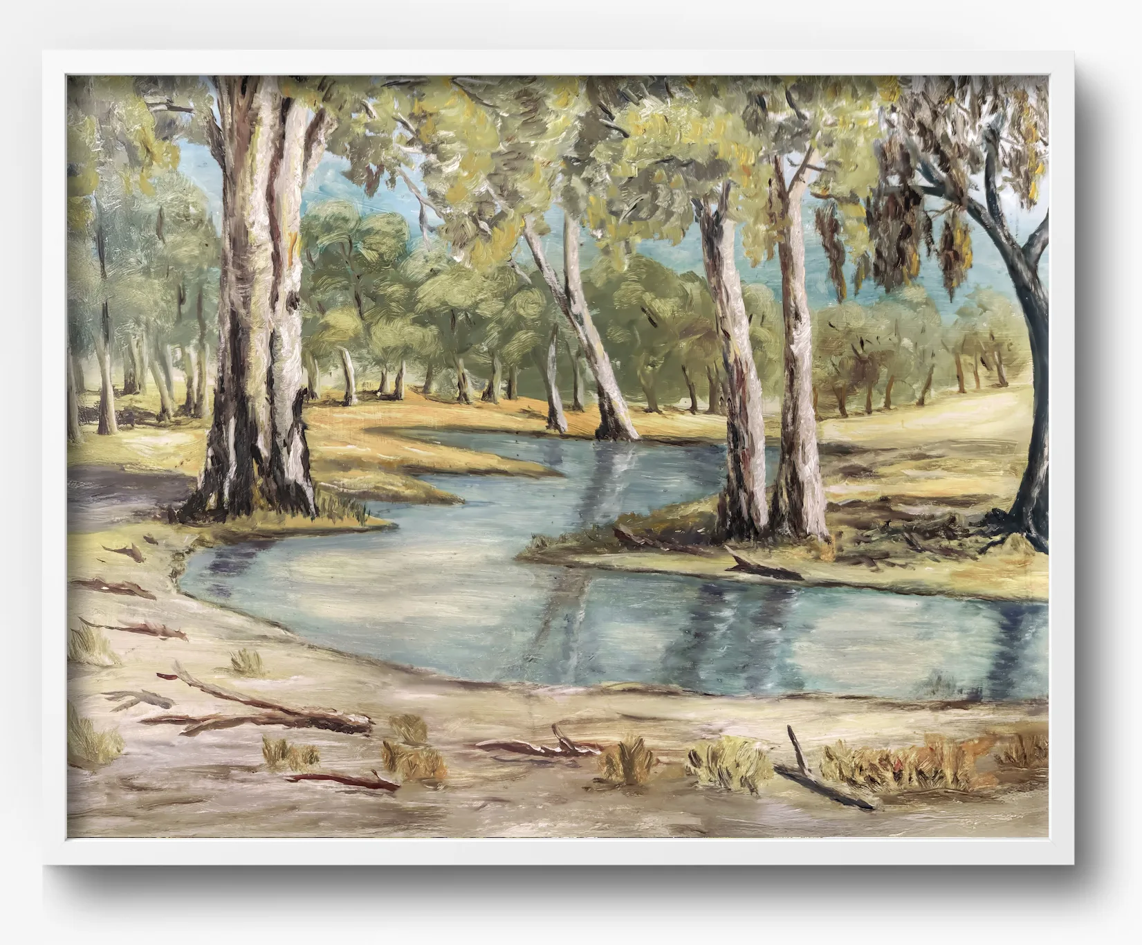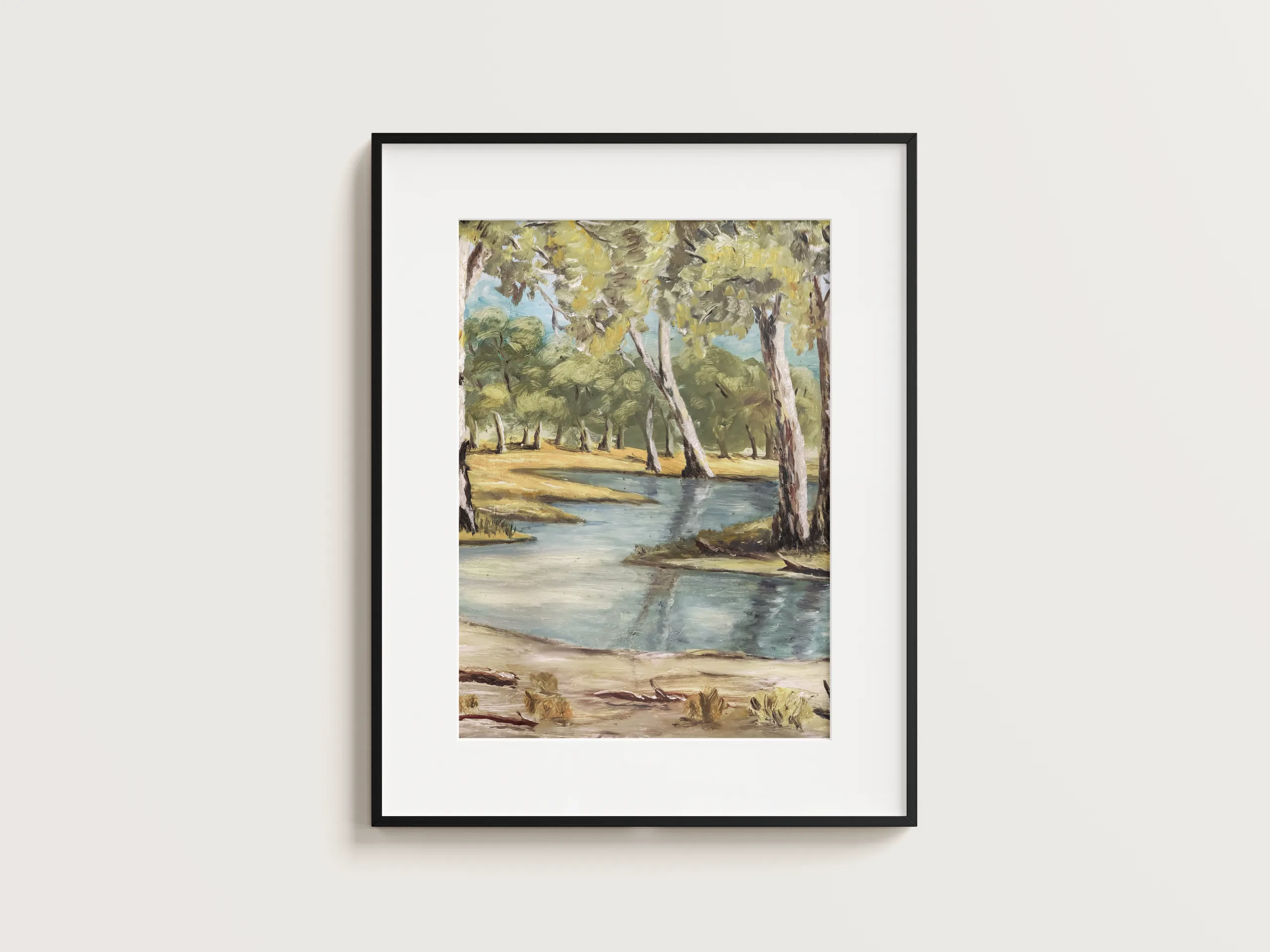 Part of the April 2025 Collection, Dry Season offers a measured study of Australia’s inland waterways at rest. The gentle arc of the creek winds through sun-bleached grasses and pale gums, each tree rendered with a confident, grounded hand. A palette of ochre, blue-grey, and silver-green reflects the stillness of the season — a landscape shaped by light, time, and repetition. Both observational and expressive, the work resists sentimentality, instead presenting the landscape as it is: open, enduring, and deeply familiar.